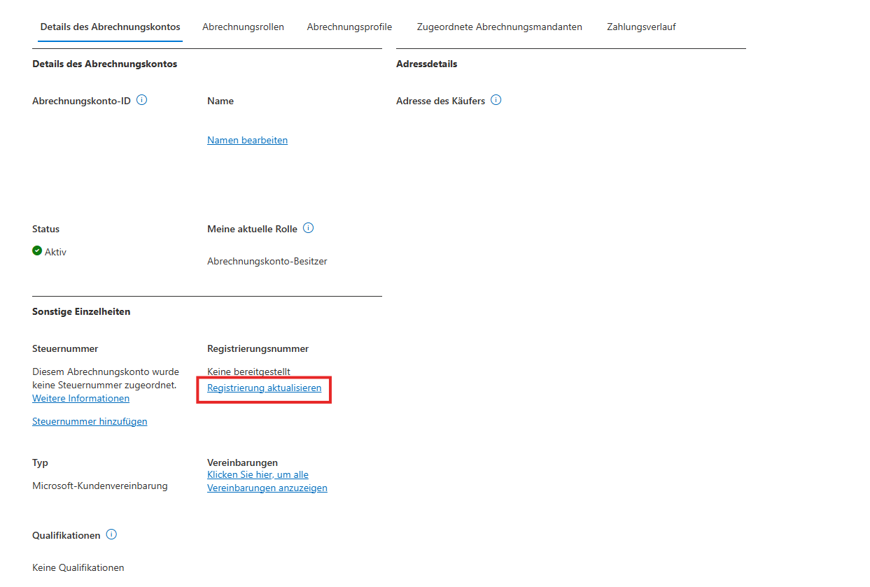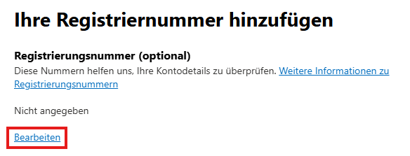 Aktualisieren Sie die Registrierungsnummer im Abrechnugskonto: