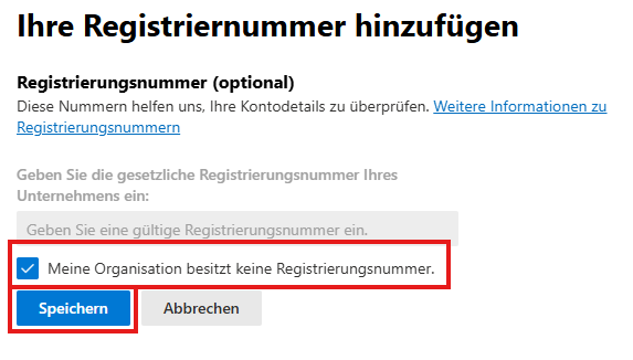 Wenn Sie keine Registrierungsnummer besitzen, setzen Sie den Haken bei "Meine Organisation besitzt keine Registrierungsnummer" und "Speichern".