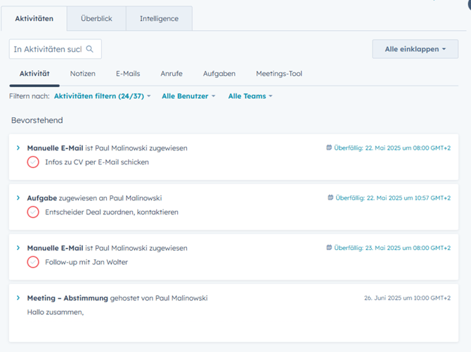 In der Mitte des Bildschirms findest du die Aktivitäten, die mit dem Kontakt verbunden sind. Hier kannst du: